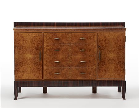 Comò Novecento in legno impiallacciato in radica ed ebano macassar con fronte a cinque cassetti centrali, due ante celanti cassetti laterali. Maniglie a fuso in ottone. Milano, anni '20. (cm 160x102x57) (difetti e restauri)