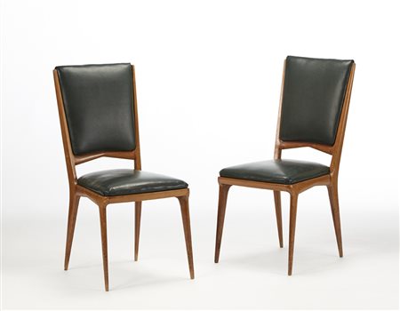 Coppia di sedie in legno massello con seduta e schienale imbottiti rivestiti in similpelle verde. Italia, anni '50. (cm 44x96x58) (lievi difetti)