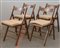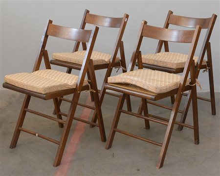 Gruppo di quattro sedie pieghevoli in legno con sedute in cannettè. Italia,...