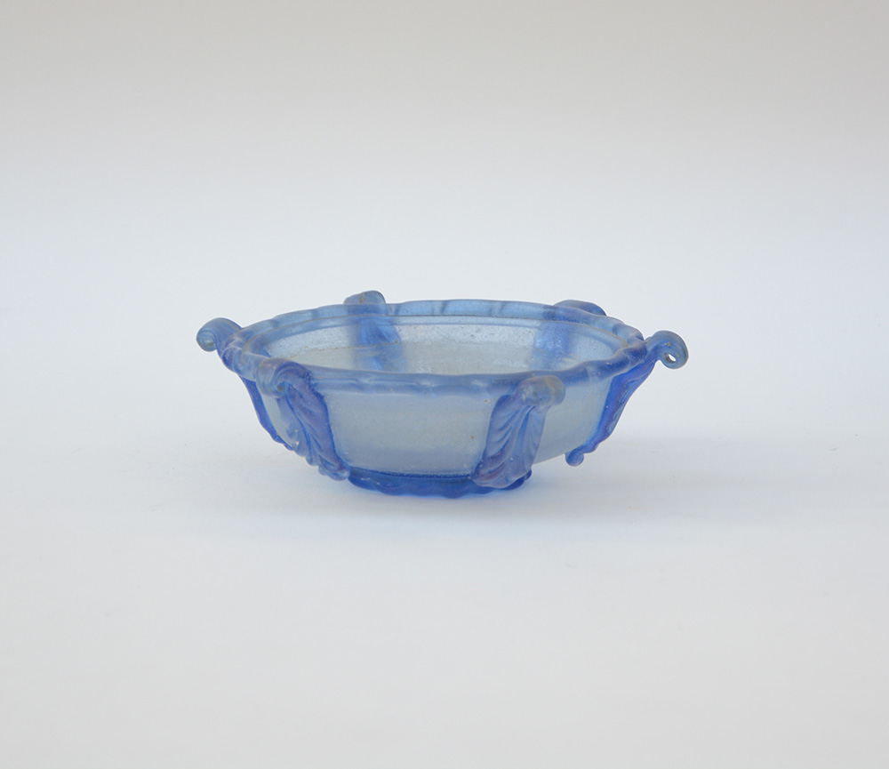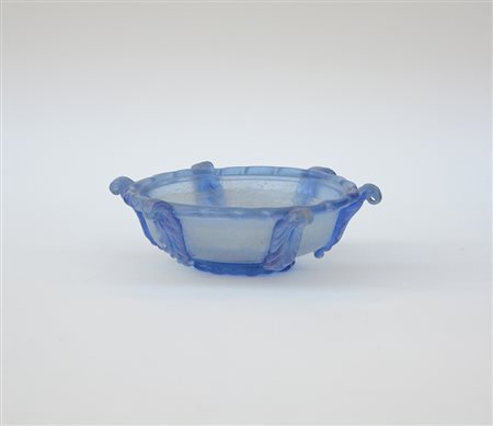 Ciotola in vetro blu con applicazioni a foglia. Secolo XX. (h cm 15)