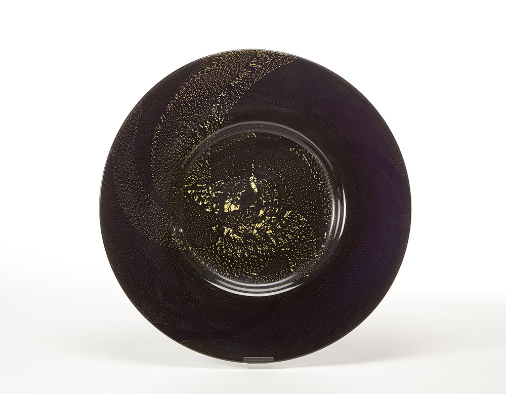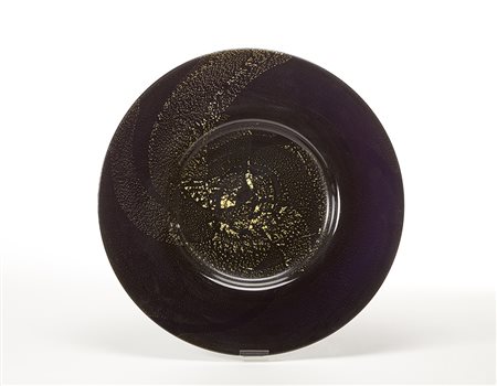 Large plate in dark amethyst glass with gold leaf inclusions. Recent execution. (d 54.5 cm.)