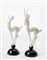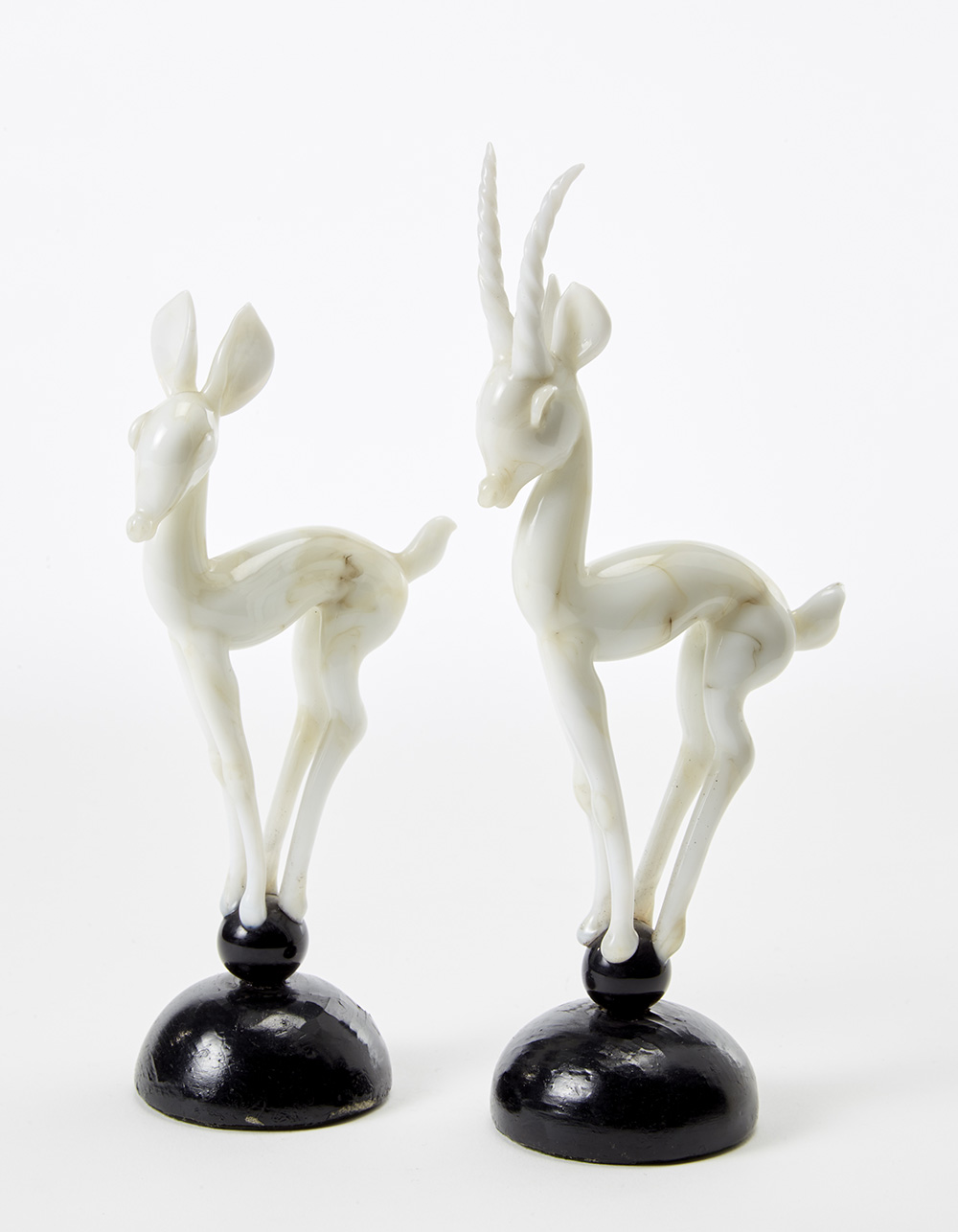 Lotto composto da due cerbiatti in vetro soffiato lattimo a striature. Base in legno ebanizzato. Anni '20. (h max cm 21) (lievi difetti)