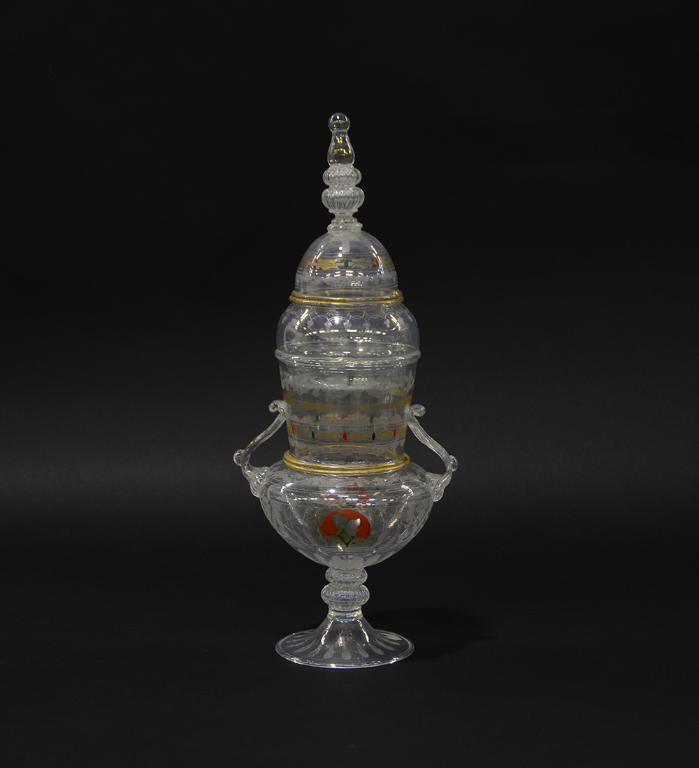 Manifattura di MuranoVaso biansato con coperchio a decori floreali alla mola...