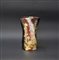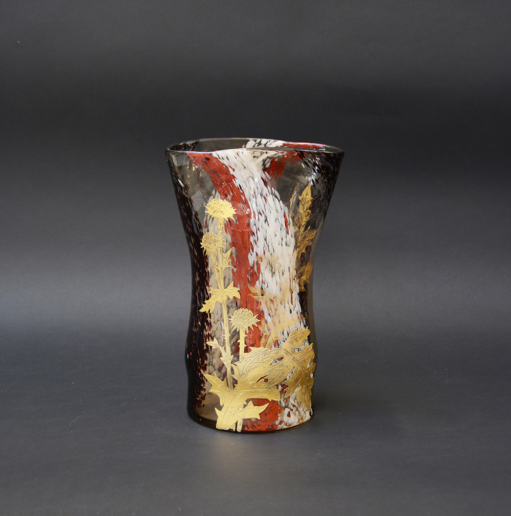 Vaso in vetro soffiato con decoro a fasce colorate e dipinto in oro a rilievo con fiori di cardo. 20. (lievi difetti)