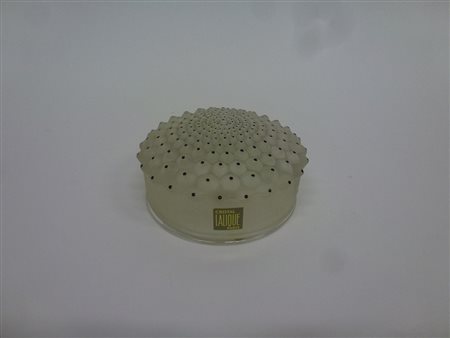 Portacipria in vetro incolore soffiato in stampo acidato e smaltato in nero sulla superficie esterna. Francia, seconda metà secolo XX. Firmato a punta sotto la base "Lalique France". (h cm 5,5; d cm 11)