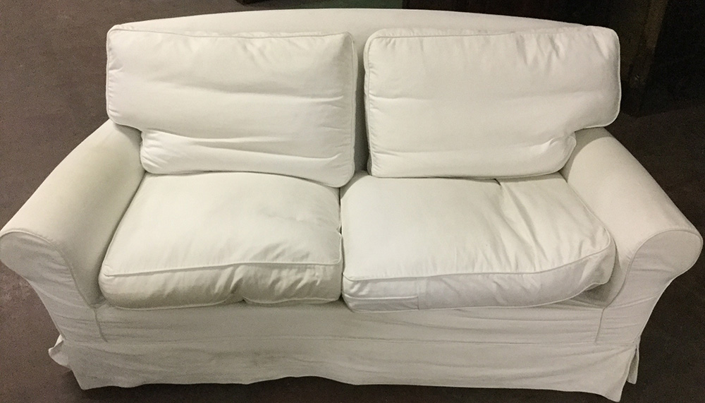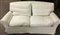 Coppia di divani a due posti rivestiti in tessuto bianco con cuscini asportabili. Italia, produzione recente. (lievi difetti)