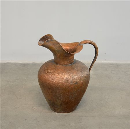 Grande acquamanile in rame martellinato e baccellato inciso a motivi stilizzati con presa sagomata. Marcato L. Costa. (h cm 63) (lievi difetti)