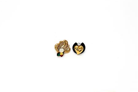 Lotto composto da due grandi anelli in metallo dorato, strass e galalite, uno con motivo a cuore l'altro con pennacchio