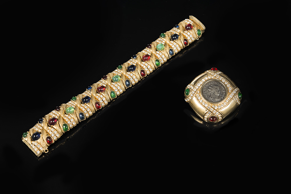Lotto in metallo color oro lucido e satinato composto da spilla e bracciale con strass incolori e cabochon rossi, verdi e blu, al centro della spilla una moneta brunita