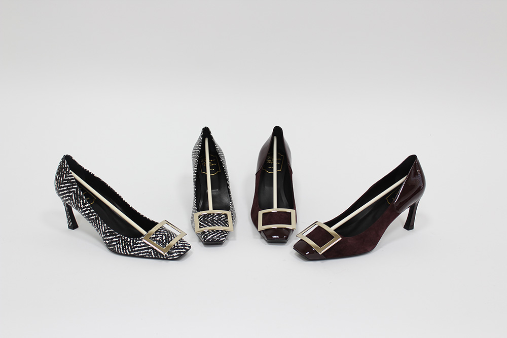 Due paia di décolté con fibbia in metallo color agento, una in camoscio e vernice color melanzana, l'altra in pelle stampata ad imitare la spina di pesce in bianco e nero, scatola e sacchetto originali (tg. 38)