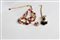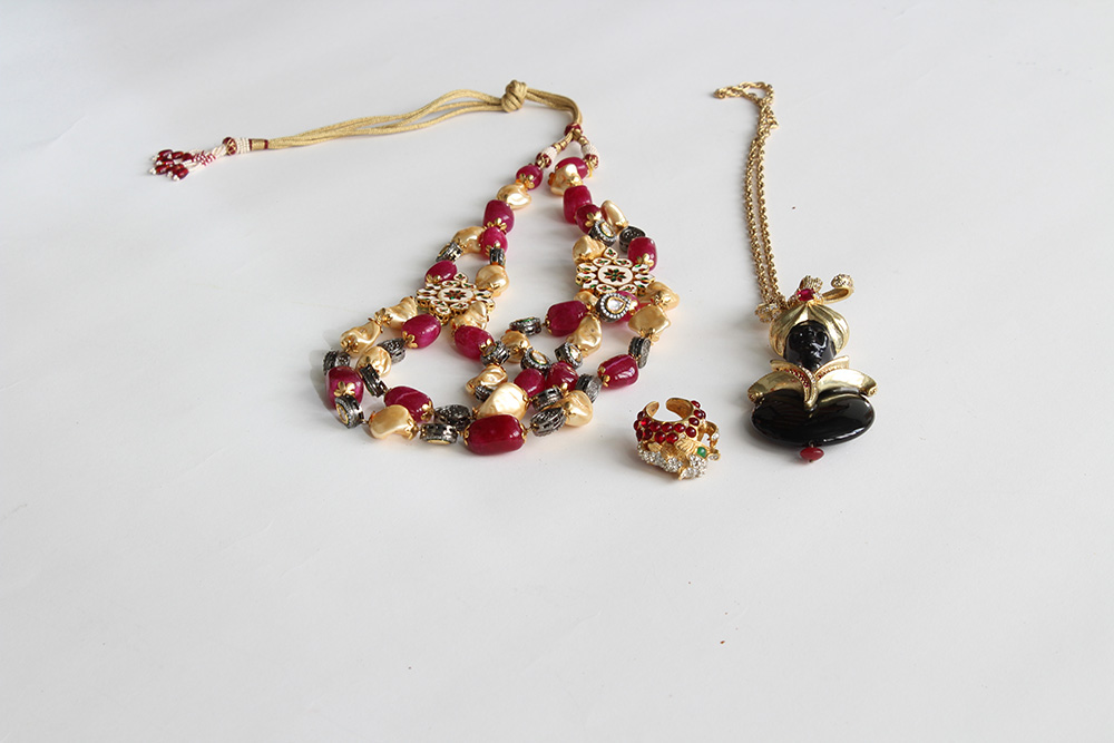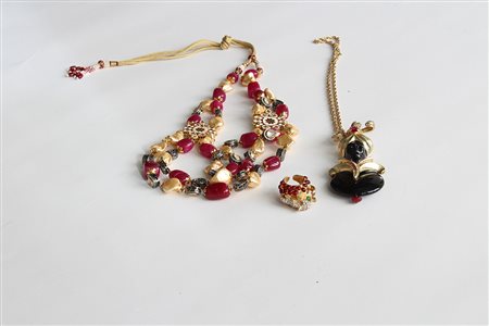 Lotto composto da una collana a tre fili con perle fancy yellow, boules rosse in vetro e strass, in metallo di diverse galvaniche con chiusura in tessuto tipica dei gioielli indiani, un pendente a guisa di "moro" con galvanica oro come la catena, rifinito con strass rossi e incolori come l'anello a guisa di pesce