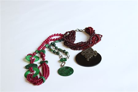 Lotto di tre collane etniche di varie lunghezze, una rifinita in metallo color nikel e strass, una in ottone, tutto sui toni del rosso e del verde, una anche terminata da un grande medaglione in legno nero