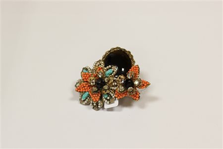 DE MATIO N.Y.Spilla in metallo color oro, perle, coralli, turchesi fancy ed...