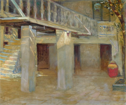 GALILEO CHINI 1873-1956 IL MIO CORTILE (A BANGKOKG) signed with monograms, titled on the reverse, oil on cardboad. Executed in 1911-1913 siglato CG; intitolato sul retro olio su cartone cm 64x76 Eseguito nel 1911-1913 PROVENANCE Galleria Arco Farnese, Roma Ivi acquistato dall'attuale proprietario nel 1996 EXHIBITED Venezia, XI Biennale Internazionale d'Arte, 1914, n. 855 Milano, Società per le Belle Arti ed Esposizione Permanente, Galileo Chini, 1977 Salsomaggiore Terme, Galileo Chini - dipinti, ceramiche, disegni 1911-1914, 1995 Roma, Galleria Arco Farnese, Galileo Chini e l'Oriente, 1996