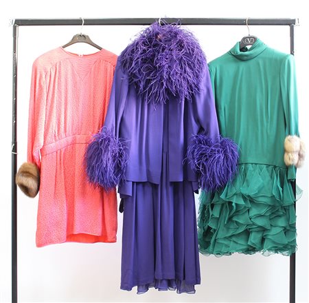 Lotto di un completo, vestito con giacca e due vestiti, in diversi colori tutti rifiniti con pelliccia o piume (tg. differenti) (difetti)