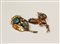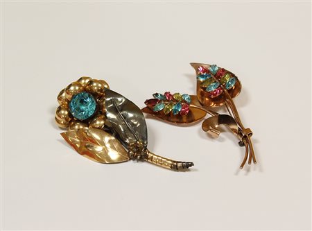 Coppia di broches floreali in metallo color oro rosso e strass a navette nei toni del celeste, giallo, rosa antico l'una, tonda celeste l'altra (lievi difetti)