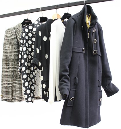 Lotto composto da due giacche di cui una con canotta abbinata, una camicia, una maglia e un cappotto tutti nei toni del nero e bianco in materiali differenti (tg. varie) (lievi segni d'uso, mancanze)