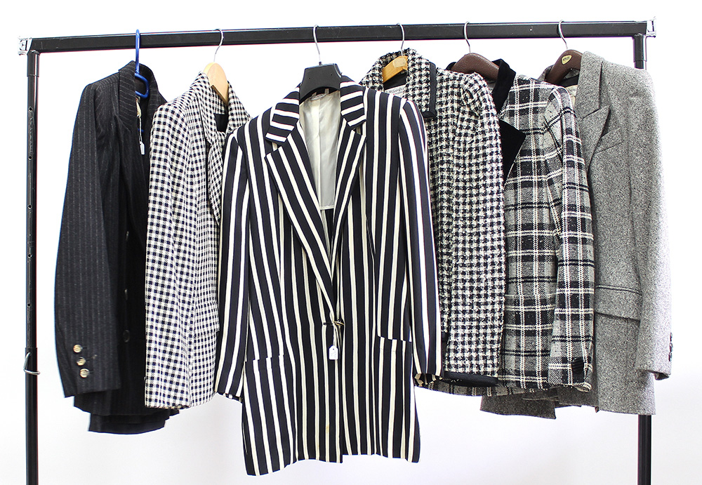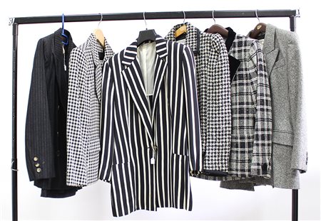 Lotto composto da quattro tailleurs e due giacche prevalentemente nei toni del nero, bianco e grigio (taglie differenti)
