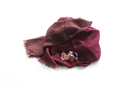 Lotto composto da una sciarpa color melanzana e cinque anelli di varie galvaniche con pietre fancy