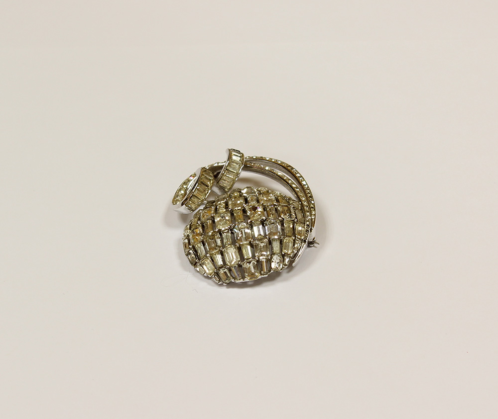 Spilla tondeggiante con strass incolori a baguette e rotondi montati su metallo color oro bianco (lievi difetti)