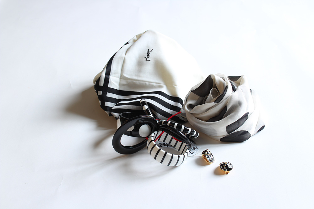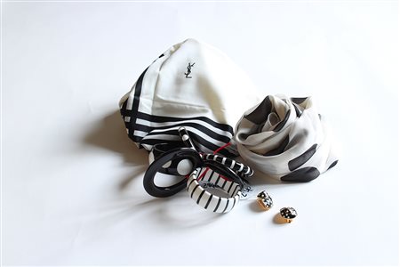 Lotto composto da un pareo in cotone, un foulard in chiffon, un paio di orecchini in metallo color oro e smalti e sette bracciali in materiale plastico, tutto sui toni del bainco e nero