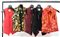 Lotto di cinque gilets: uno in fustagno trapuntato con schiena in foulard nei toni del bordeaux, uno in camoscio nero con schiena in foulard, uno in bourette di seta rossa con schiena in foulard, due interamente in foulard con cerniera (tg. 40-46)