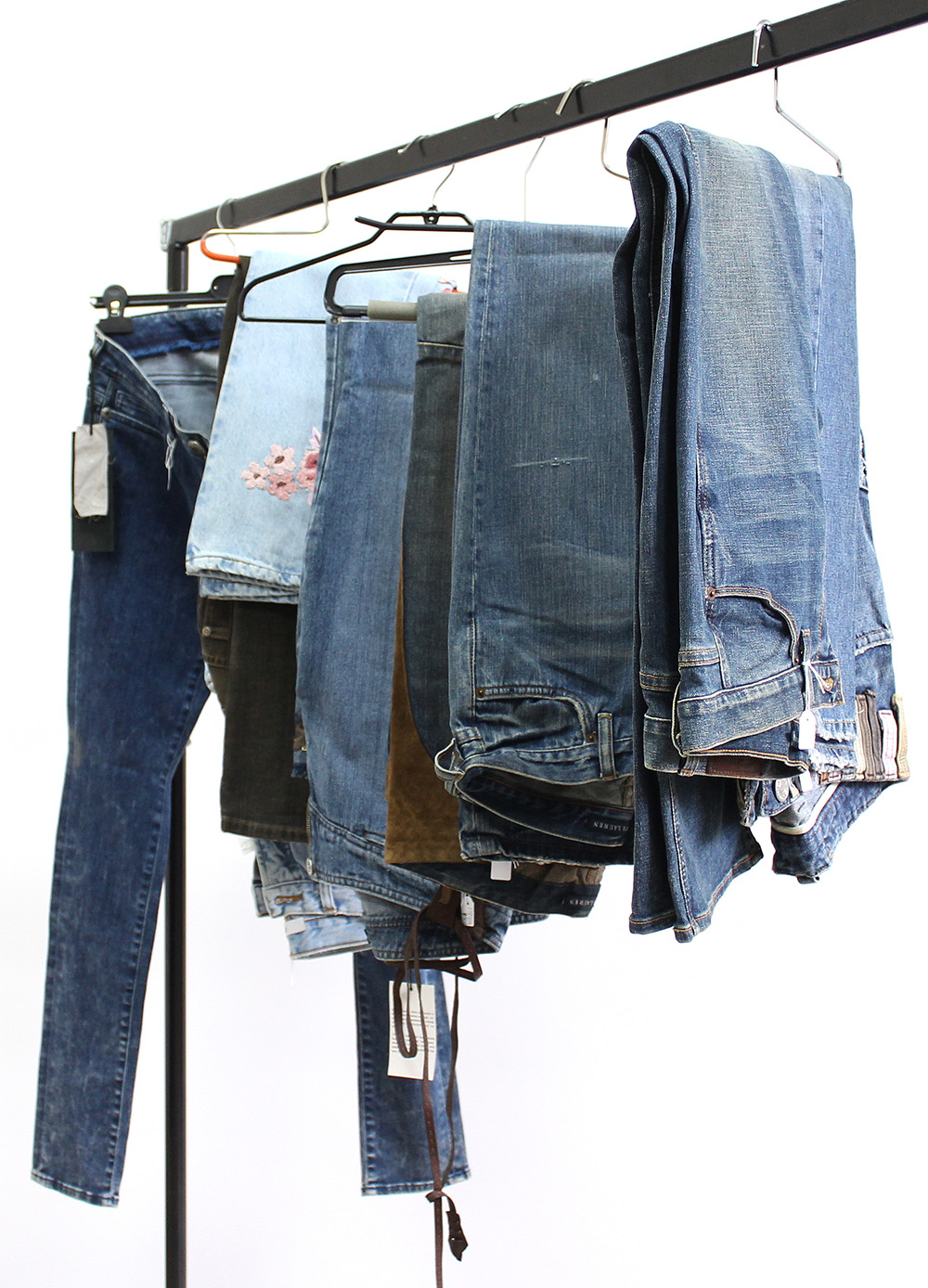 Lotto composto da otto paia di pantaloni jeans, diverse fatture, con inserti in pelle, ricami, perline etc (tg. varie) (segni d'uso)