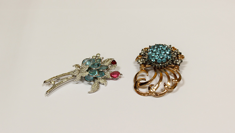 Due spille floreali in metallo color oro rosso e bianco con strass e vetri di vari colori (lievi difetti)