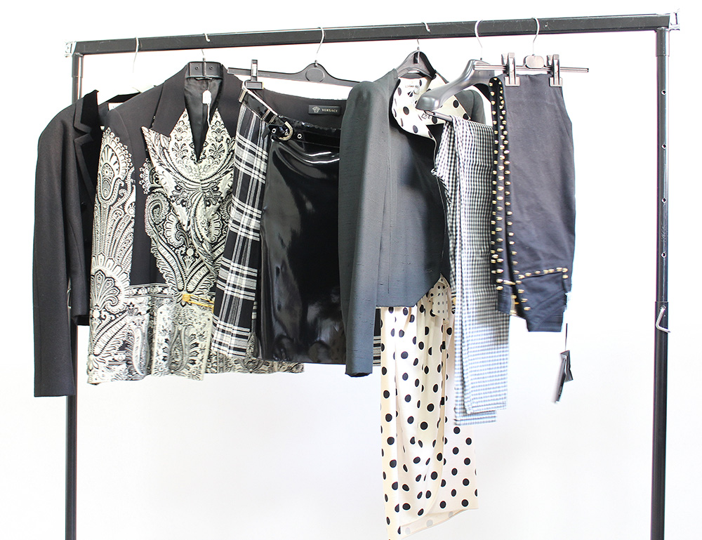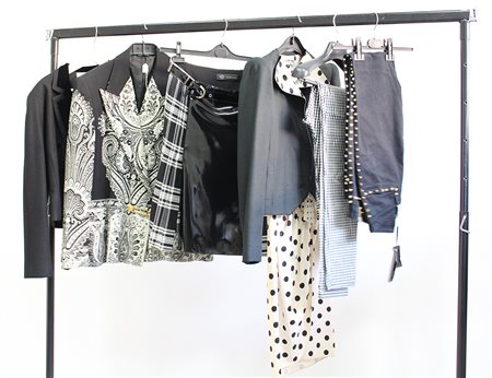 Lotto composto da un vestito in shantung di seta a pois con giacca nera, due giacche diverse, un kilt e due paia di pantaloni, tutto nei toni del nero e bianco (tg. varie) (lievi segni d'uso)