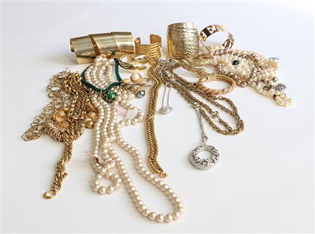 Lotto composto da sedici tra colliers e catenine con pendenti e otto bracciali, molti in metallo color oro, alcuni in argento 925 e molti rifiniti con perle fancy e strass. Un collier in parte in tessuto verde come lo smalto