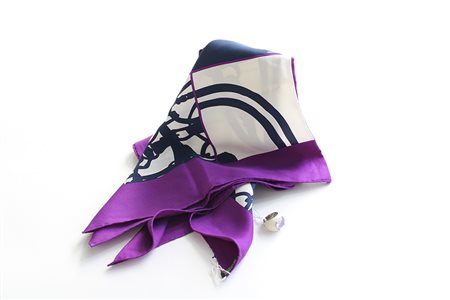 Lotto composto da un carré 70 "en desordre" sui toni del blu del viola e del bianco e un anello in metallo, smalti e pietra fancy con le stesse nuances