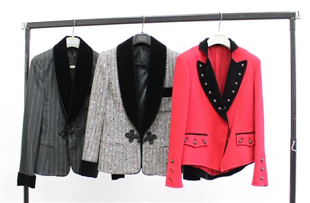 Lotto composto da tre giacche in lana, una in lana rossa con revers in velluto nero e borchie, una grigio mélange con collo sciallato in velluto e una in gessato grigio con collo sciallato in velluto nero (tg. 42/44)