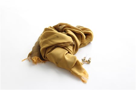 Lotto composto da una sciarpa in chiffon logato nelle nuances del senape e un paio di orecchini a clips con pendente a cuore in metallo color oro e strass