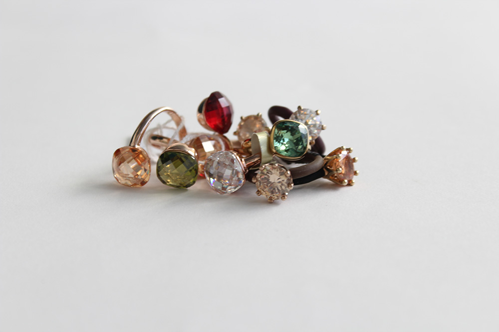 Lotto di dodici anelli in metallo color oro giallo e rosso, alcuni con gambo in cauciù e gomma, pietre fancy a ricordare Pomellato