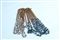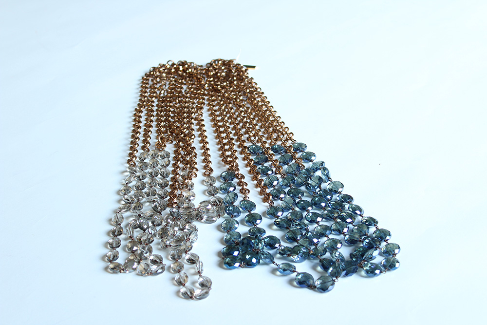 Lotto di due collane lunghe a più fili di rolò color oro rosso, una rifinita con strass briolé color blu e l'altra incolori. La seconda priva di targhetta Odicini