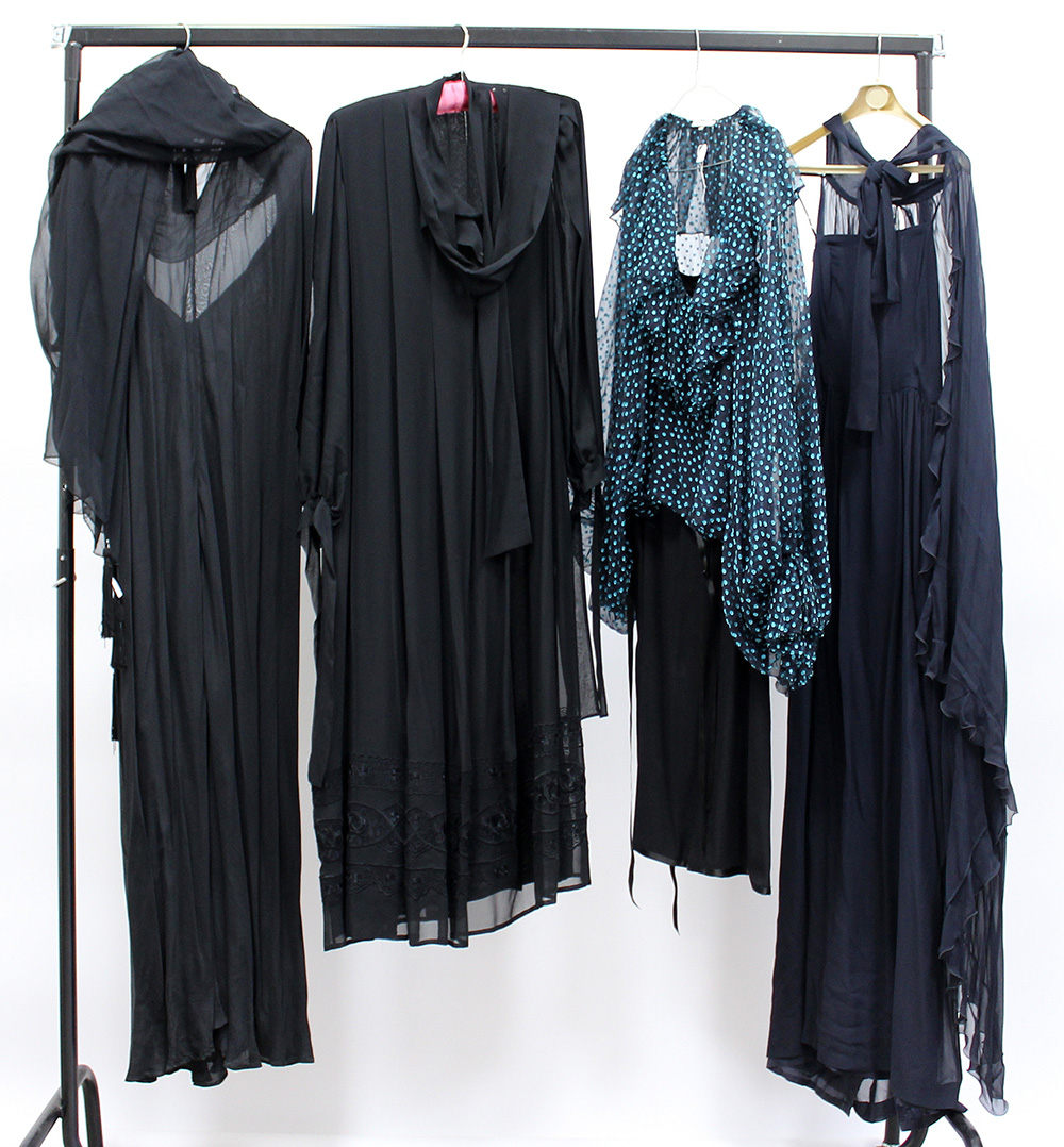 Lotto di quattro abiti con rispettive stole o coprispalle, nei toni prevalentemente del nero e blu (tg. Differenti) (lievi difetti)
