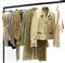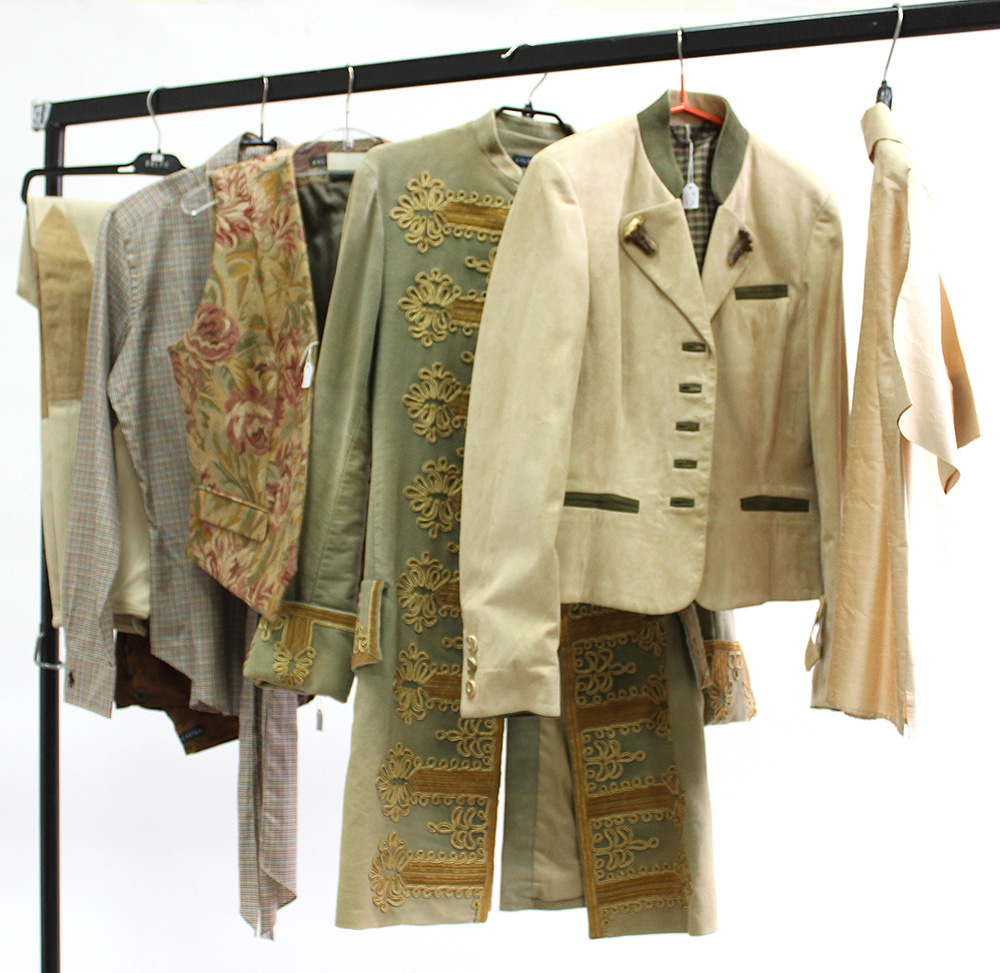 Lotto composto da due camicie di cui una in shantung a maniche corte, un gilet in tessuto broccato, una giacca in camoscio, due paia di pantaloni e un cappotto/marsina in fustagno con applicazioni di passamanera color oro (tg. 6 e 8)