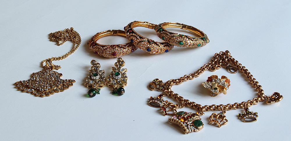 Lotto composto da un collier con charms a guisa di corone rifinito con strass di colori vari e perle fancy, un anello a guisa di drago con strass e perle fancy e cinque pezzi di cui una collana, un paio di orecchini e tre bracciali rigidi a ricordare il periodo indiano "Moghul", rifiniti con strass e smalti