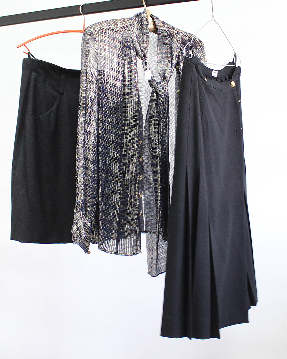 Lotto composto da due gonne in lana e una camicia in seta lamé (tg. Differenti) (lievi difetti)
