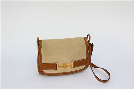 HERMÈS Borsa a tracolla in canvas a pelle martellata color cognac, finiture...