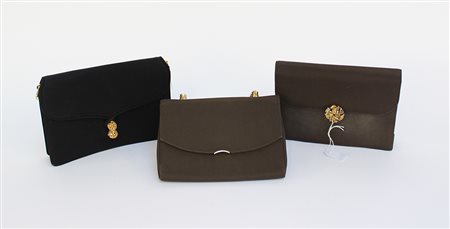 Lotto di tre borsette da sera in crêpe di seta nera o marrone, due con chiusura gioiello (difetti segni d'uso e mancanze)