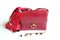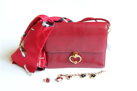 Lotto composto da borsetta in lucertola rossa con tracolla, dettagli in metallo colo oro, un foulard in seta sulle nuances del rosso, nero e beige raffiguranti diverse razze di cani, due anelli con smalti e pietre incolori rosse e bracciale con charms con smalti neri rossi e strass (cm 21.5)