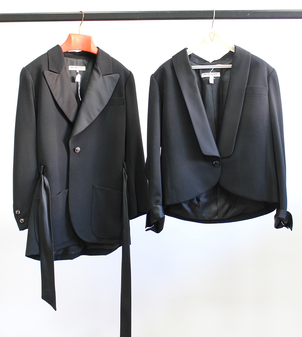 Lotto di due giacche in lana nera con revers in raso di seta, una con bottoni gioiello (tg. 40 e42) (lievi difetti)