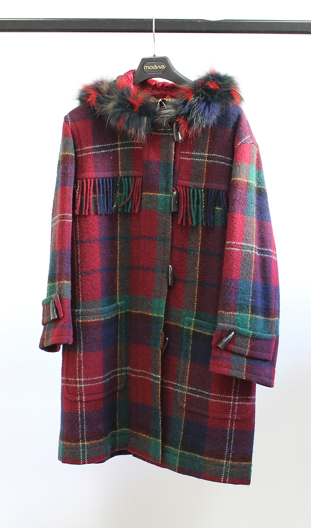 Montgomery in lana tartan sui toni del verde e bordeaux, con cappuccio e frangia, rifinito in pelo, bottoni in corno (tg. 38 francese)