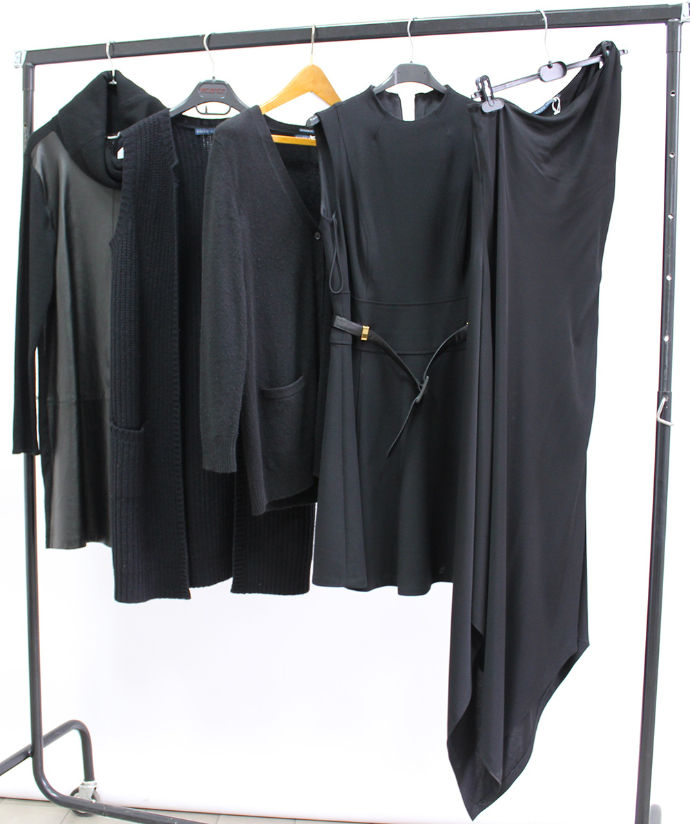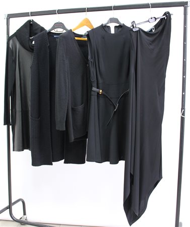 Lotto composto da un vestito lungo monospalla in maglia, due vestiti di cui uno in maglia e nappa, un cardigan e un gilet lungo in maglia di lana tutto in tinta unita nera (tg. 8)