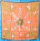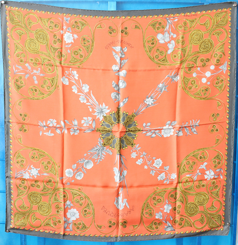 Foulard in seta "Arabesques", Henri d'Origny 1963, fondo geranio bordo verde muschio (lievi segni d'uso)