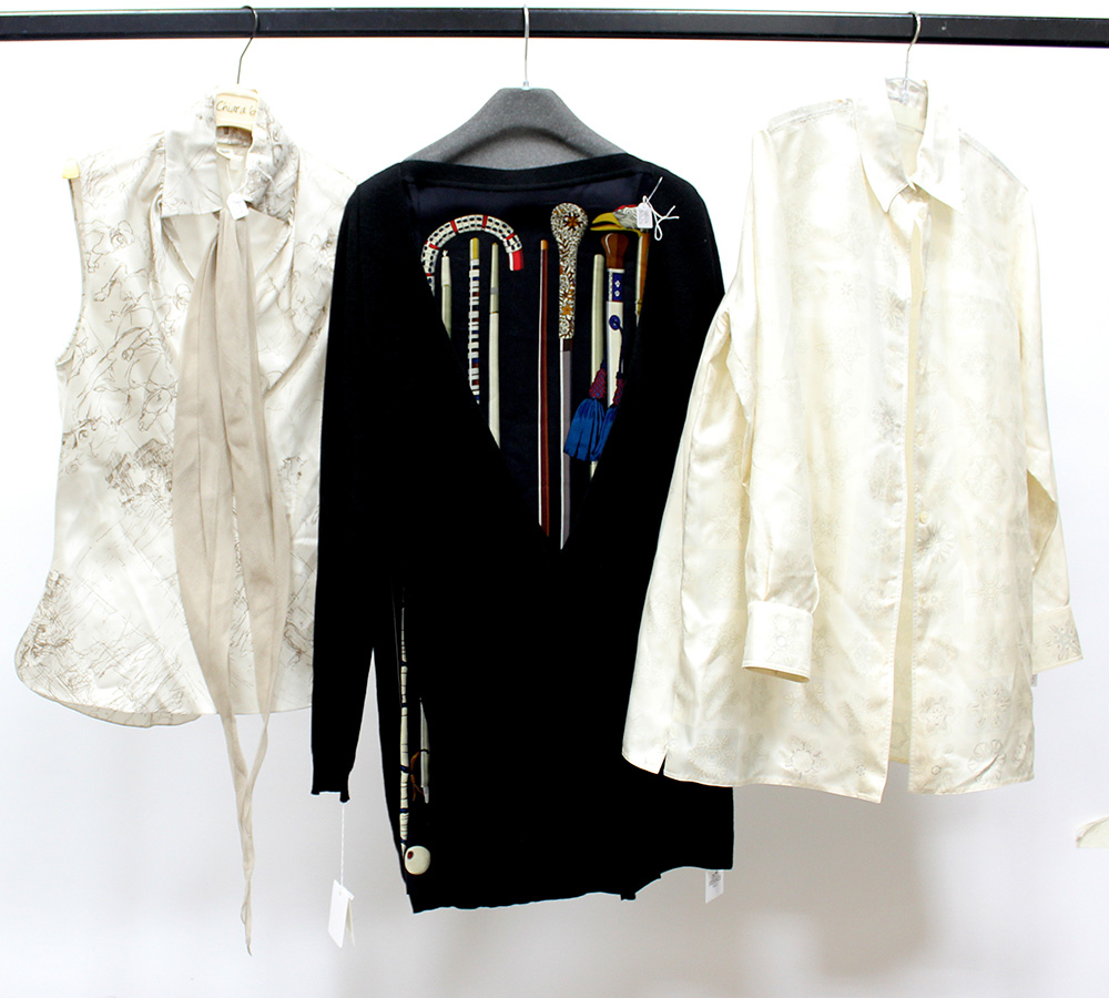Lotto composto da due camice in seta, di cui una senza maniche nei toni dell'avorio e una tunica in crêpe-de-chine "Cannes" e maglia di cachemere e seta a maniche lunghe nei toni del nero (tg. 36/40 francese) (cm ld)