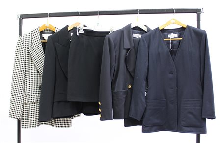Lotto composto da due tailleurs, giacca con gonna, uno giacca con pantalone e una giacca a quadretti bianchi e neri (tg. varie)