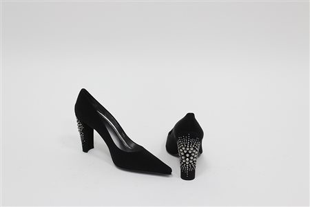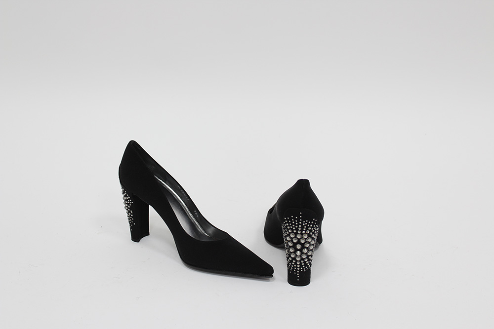 Décoltés in crêpe nera con tacco decorato in strass a stella (tg. 38.5)