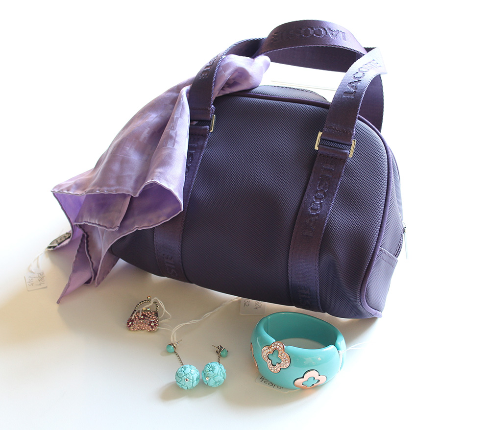 Lotto composto da una borsetta a due manici in tessuto tecnico, un minifoulard logato in seta, entrambi sui toni del viola, una spilla con strass sui toni del rosa, un bracciale e un paio di orecchini pendenti in materiale a ricordare il turchese. Il bracciale rifinito con strass (cm 23.5)